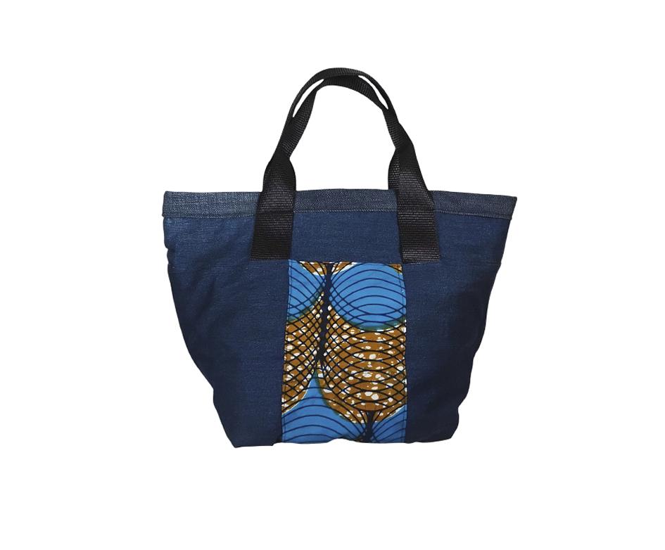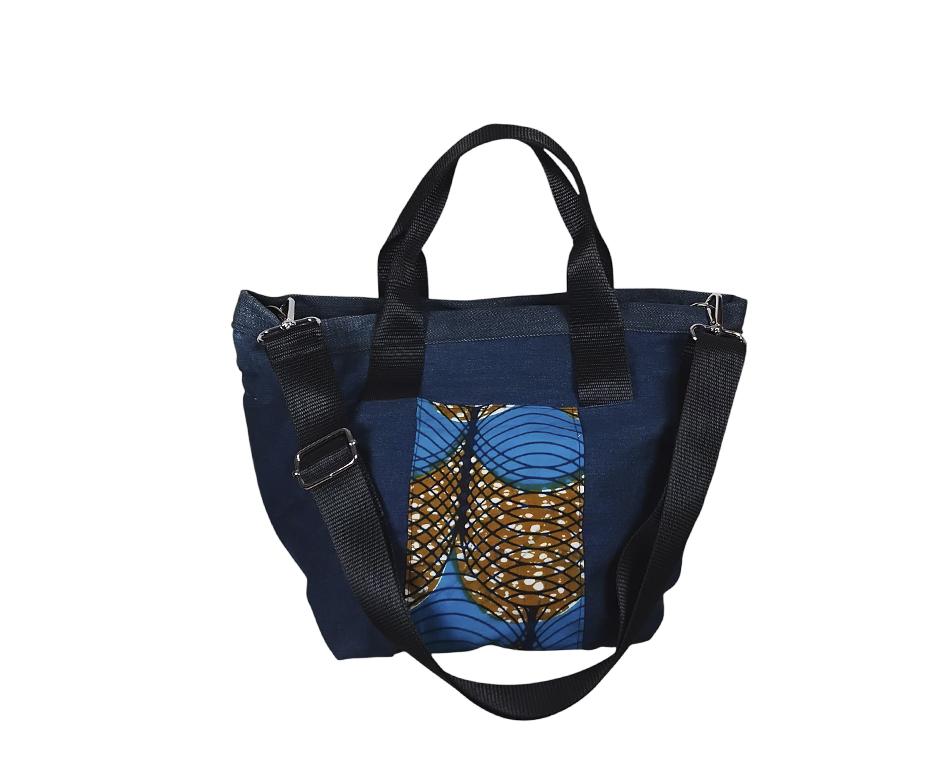 Bolso hecho con jeans recyclado y tela wax Africana